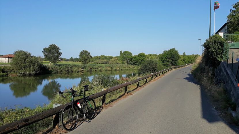 Auf einem kleinen Landsträßchen ohne Verkehr fahren wir über St. André de Seignanx und das idyllisch gelegene St. Barthélémy hinunter an den Adour und überqueren bei Urt die einzige Brücke zwischen Bayonne und Peyrehorade. Auf der baskischen Seite des Flusses rollen wir auf flachem Terrain entspannt bis nach Peyrehorade, wo wir im Schatten der imposanten Kirche St. Martin einen kleinen Snack einnehmen können.