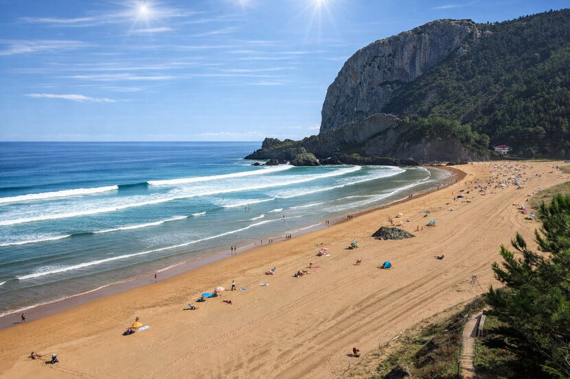 Hinter Elantxobe bei km 36 hat man die Möglichkeit, in der Bilderbuch-Bucht „Laga“ einen Badestopp einzulegen – oder man fährt noch 4 km weiter bis zum breiten Laida-Strand. Anschließend wird es grüner und deutlich flacher – ein angenehmer Kontrast zu den Rampen an der Küste.