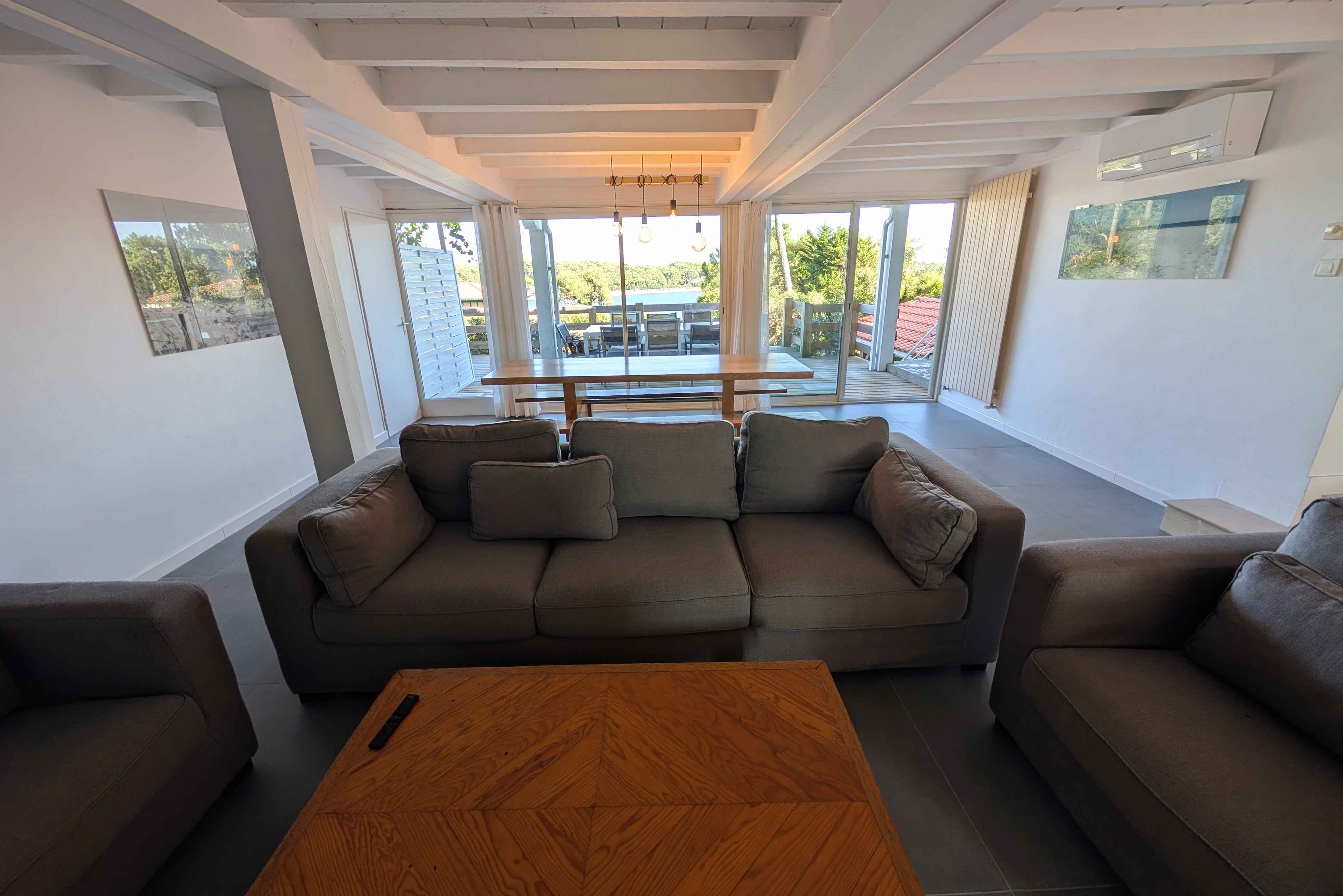 Die moderne Wohnung ist mit viel Geschmack eingerichtet. Das großzügige und helle Wohnzimmer mit herrlichem Blick auf den See von Hossegor besteht aus Kamin, einer breiten Couchgarnitur und Fernseher mit Satellitenempfang. An den Essplatz mit Klavier schließt sich eine Leseecke mit zwei weiteren Couchgarnituren und Stereoanlage an. Ein Internetanschluss (via W-LAN) steht zur Verfügung.