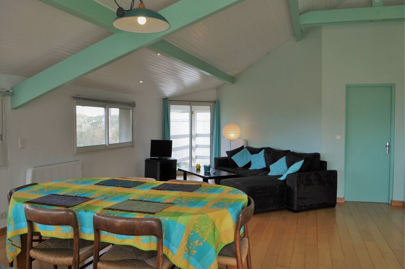 Das helle Wohn- und Esszimmer mit herrlichem Blick auf den Pinienwald, die Dünen und das Meer besteht aus einer breiten Couchgarnitur und einem Satelliten-Fernseher für den Empfang deutscher Programme. Ein Internetzugang (via W-LAN) steht ebenfalls zur Verfügung.