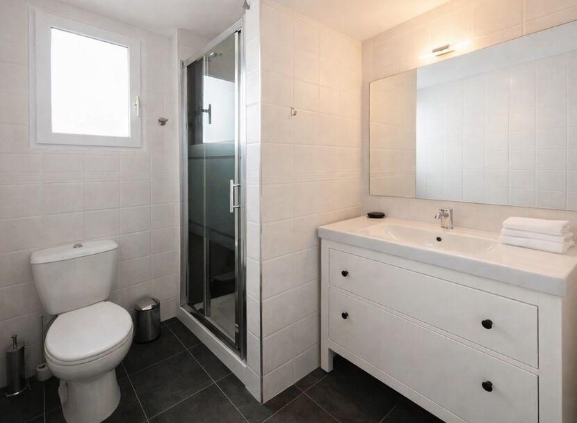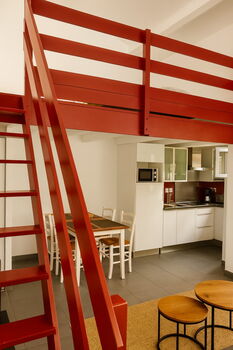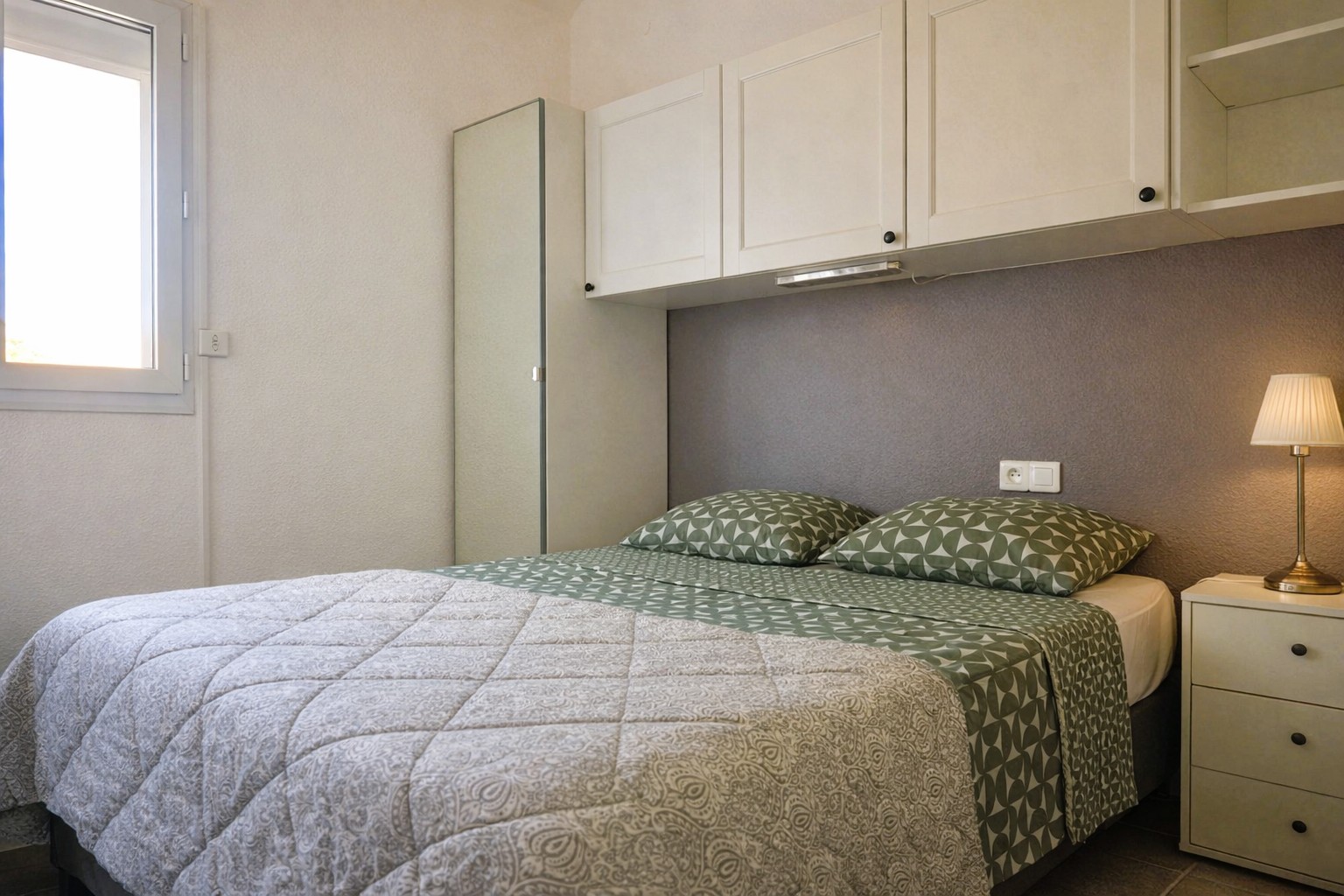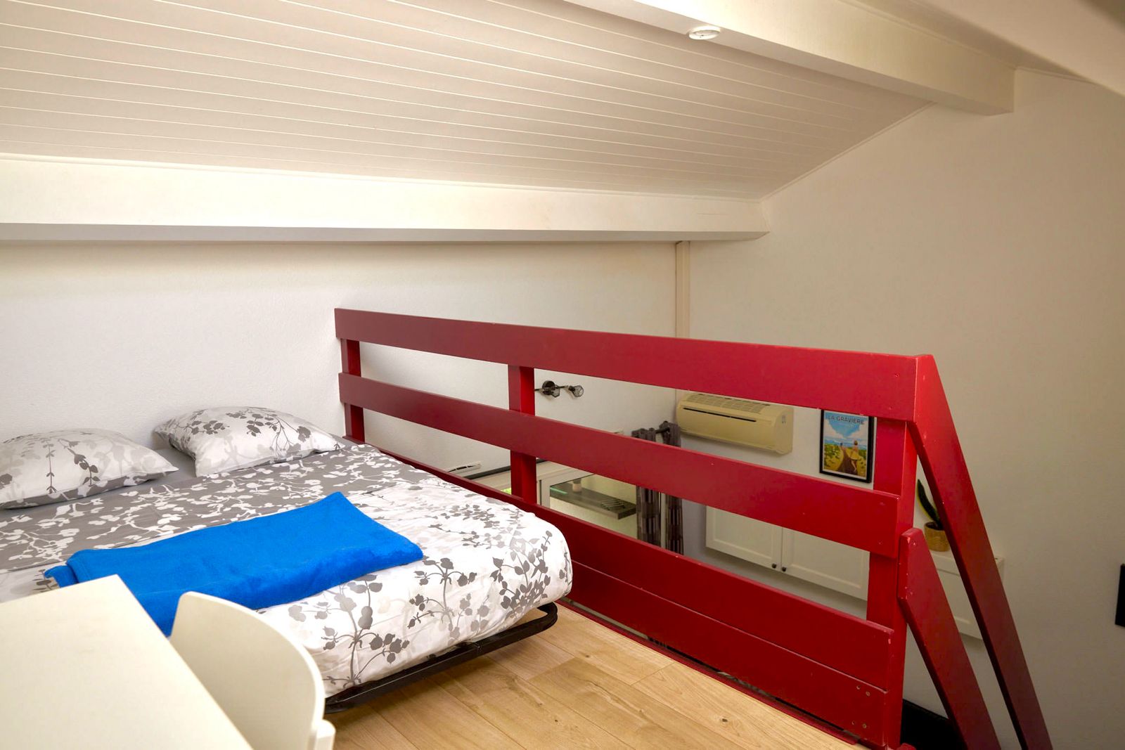 Das Schlafzimmer im Erdgeschoss verfügt über ein Doppelbett (160 cm breit). Das Bad ist mit einer Dusche, einem Waschbecken, einer Waschmaschine und einem W.C. ausgestattet. Auf der (zum Wohnraum hin offenen) Empore befindet sich ein Doppelbett (160 cm breit).