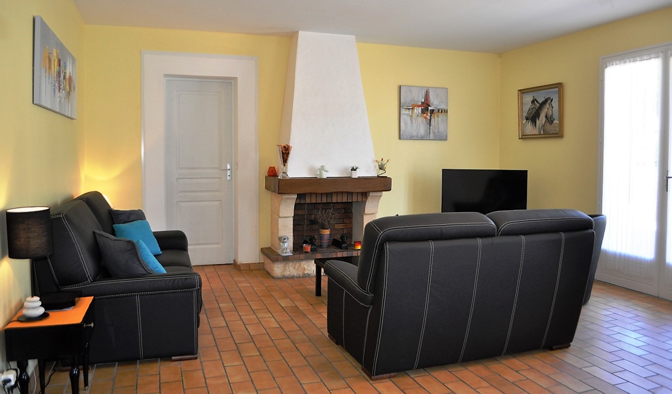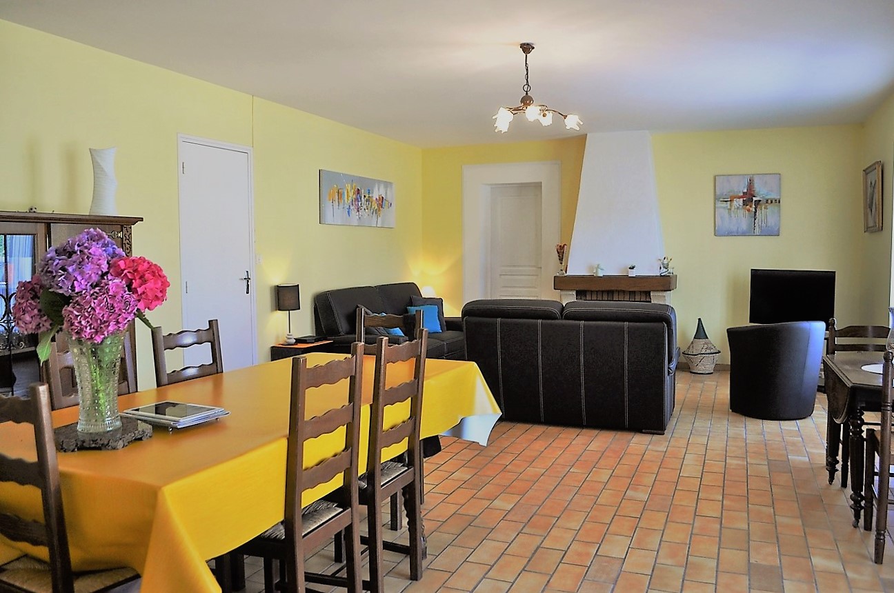Das großzügige Wohn- und Esszimmer mit Kamin besteht aus einer Couch, zwei Sesseln und einem Fernseher sowie einem Esstisch für 8 Personen. Ein kostenloser Internetzugang via W-LAN ist vorhanden.